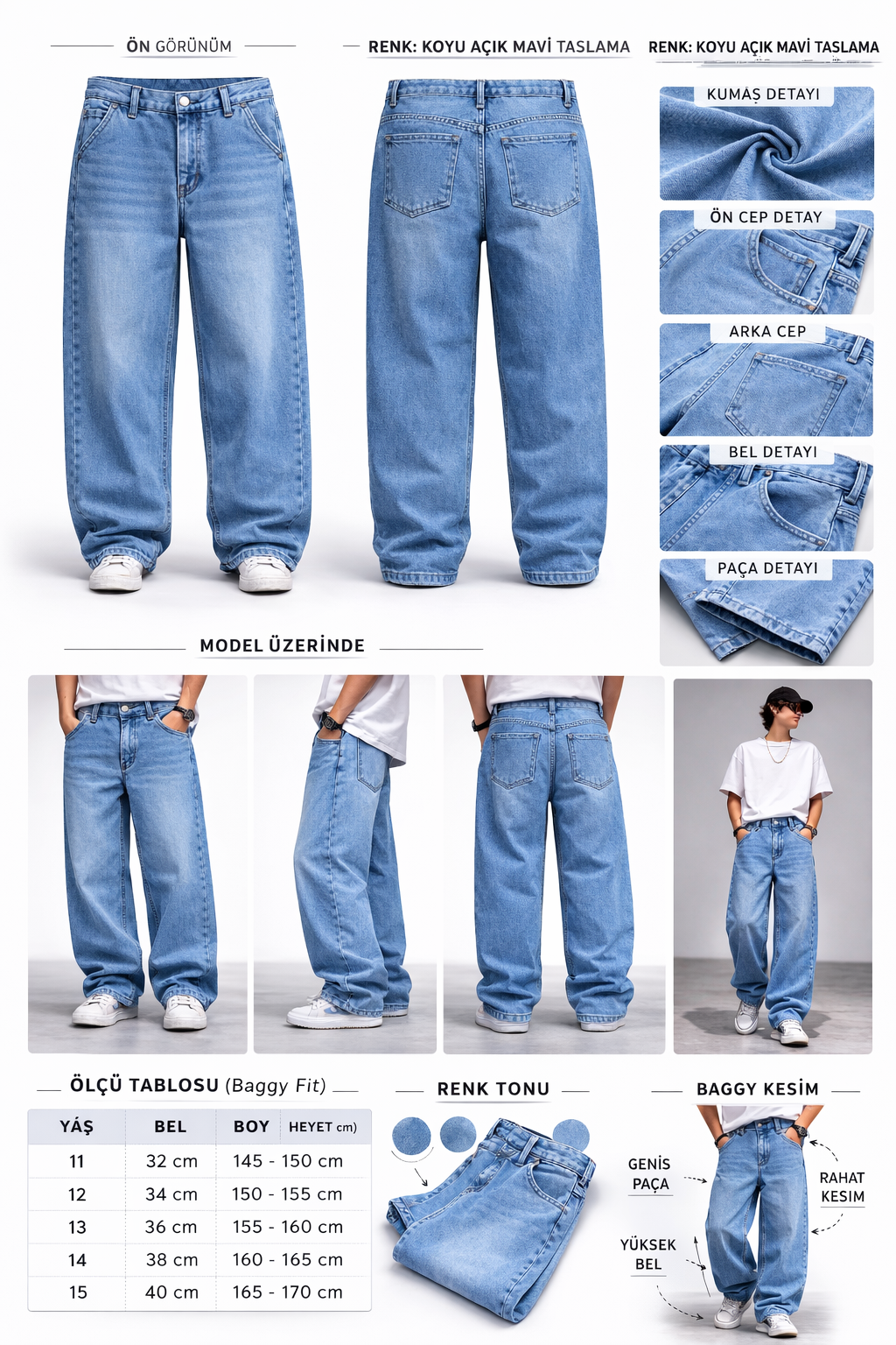 Bebecan'ın şık ve modern tasarımları ile gençlerin tarzını tamamlayan 11/15 yaş Bagy Jean Açık Mavi Kot Pantolon, hem rahatlığı hem de şıklığıyla öne çıkıyor. Bu pantolon, özellikle gençler için tasarlanmış olup, günlük kullanımda ve özel günlerde rahatça giyilebilecek bir parçadır.