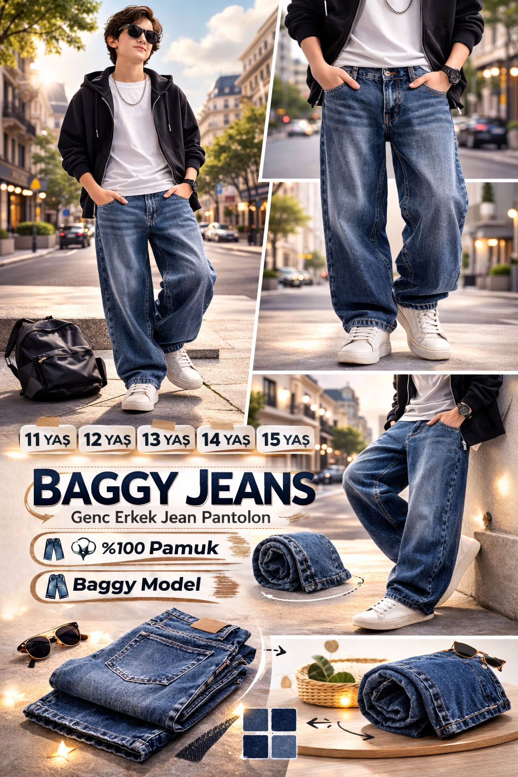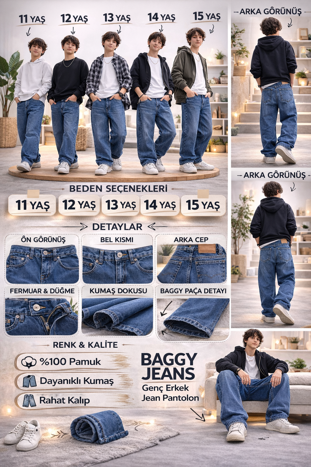Bebecan 11/15 yaş erkek çocuk baggy model kot pantolon, stil ve konforu bir arada sunan mükemmel bir üründür. Kaliteli malzemesi ve şık tasarımı sayesinde, çocuğunuzun dolabında yer alması gereken bir parçadır. Gün boyu rahat hareket edebilmesi için ihtiyacı olan özgürlüğü sağlarken, aynı zamanda modern görünüm kazanmasını da sağlar. Hem ebeveynlerin hem de çocukların beğenisini toplayacak bu pantolon, indirimli fiyatı ile sizi bekliyor.