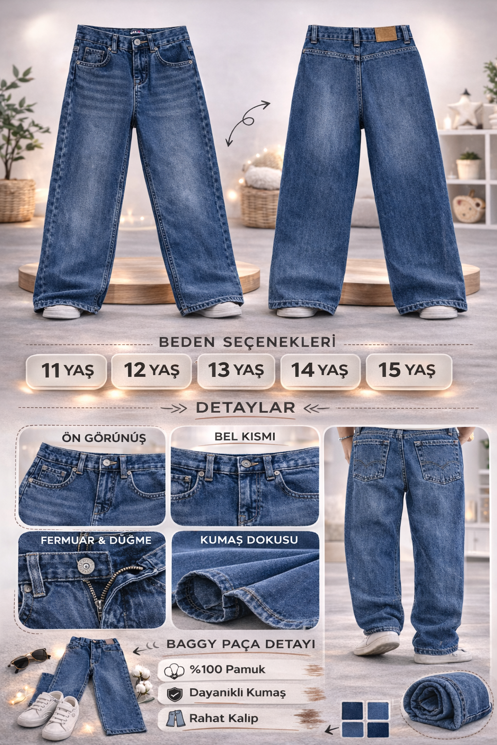 Çocuklar için hem rahat hem de şık bir giyim seçeneği arıyorsanız, Bebecan 11/15 yaş erkek çocuk baggy model kot pantolon tam size göre. Yenilikçi tasarımı ve kaliteli kumaşıyla çocukların stiline bütünlük katarken, hareket özgürlüğü sunarak günlük aktivitelerinde rahatça hareket etmelerini sağlar.