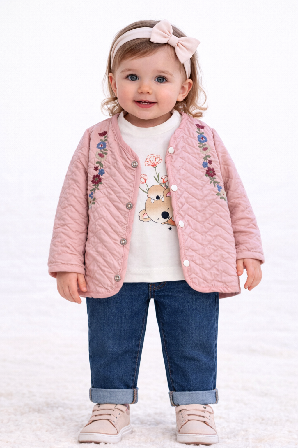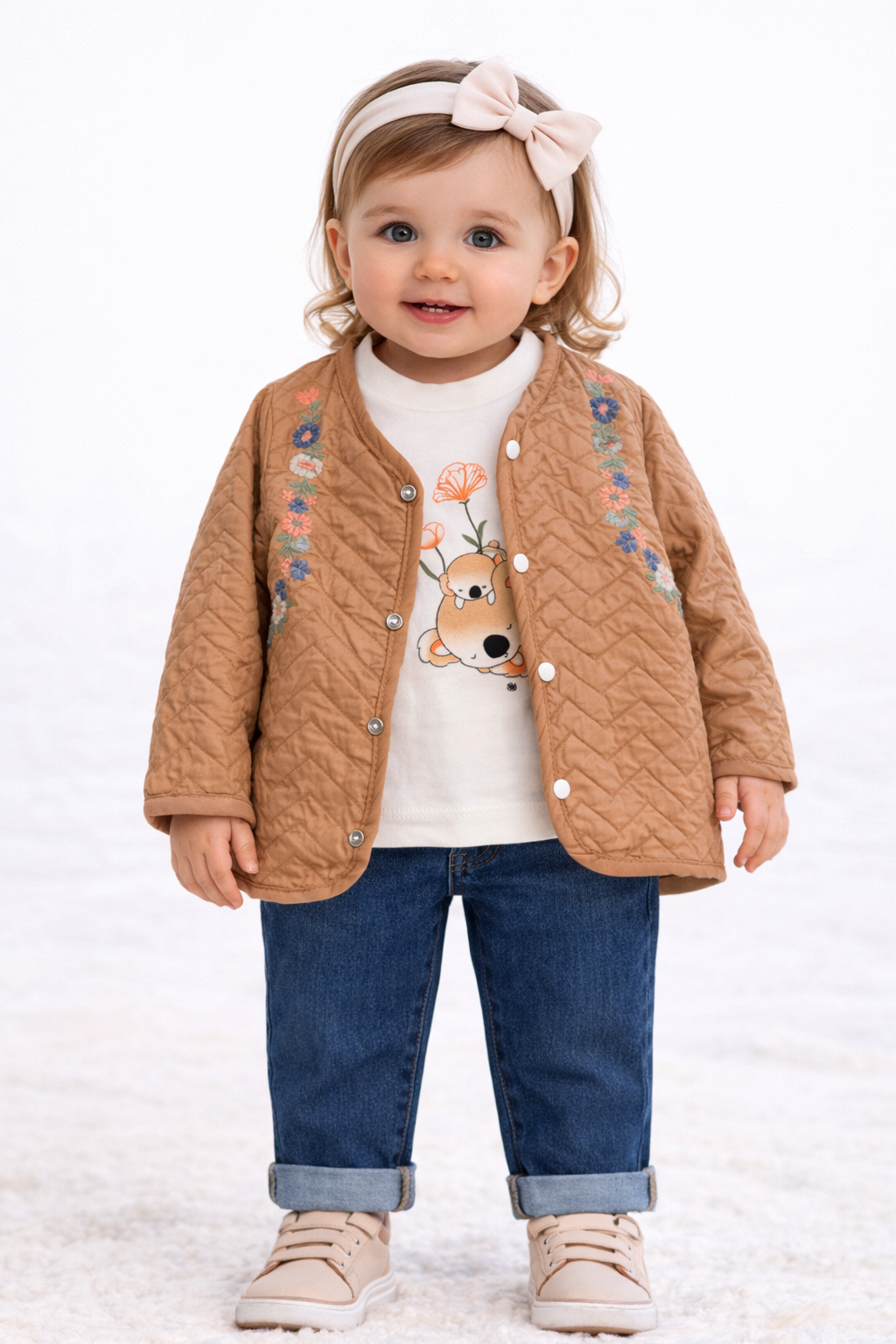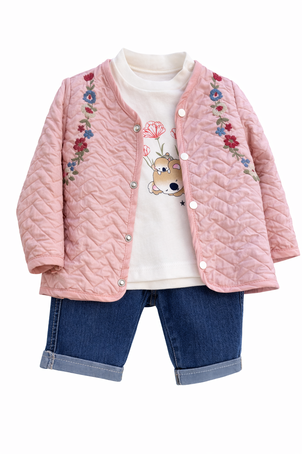 - Kapiton Ceket: Takımın en dikkat çekici parçasıdır. Yumuşak dokusu ve kaliteli kapitone kumaşı sayesinde hem şık hem de sıcak tutar. Ceketteki kapaklı cepler, minik eşyalarını taşıması için ideal bir alan sağlar.