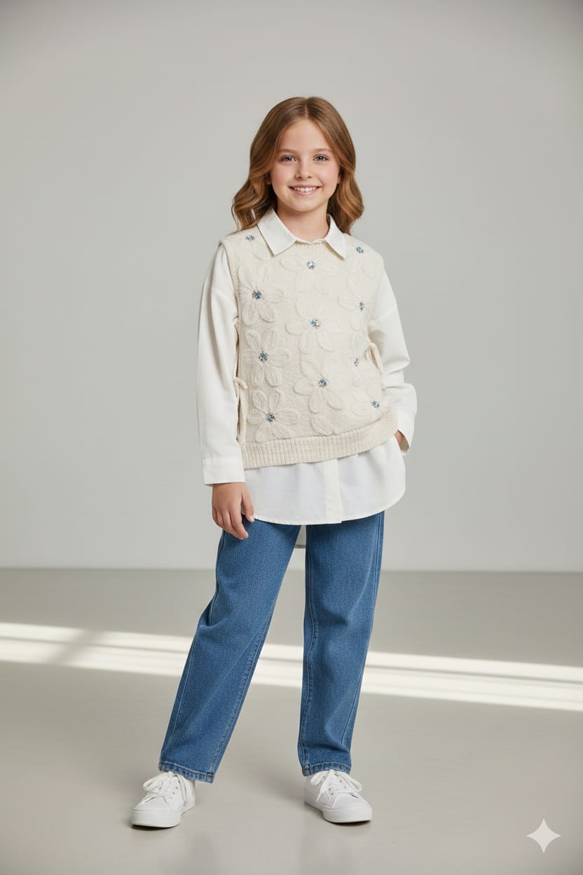 - Kot Pantolon: Takımın tamamlayıcısı olan kot pantolon, esnek bel yapısıyla çocukların aktif yaşamlarına uyum sağlar. Yüksek kaliteli denim kumaş kullanılarak üretilen bu pantolon, hem dayanıklıdır hem de çeşitli kombinler için idealdir. Hem rahat hem de şık bir görünüm sunar.