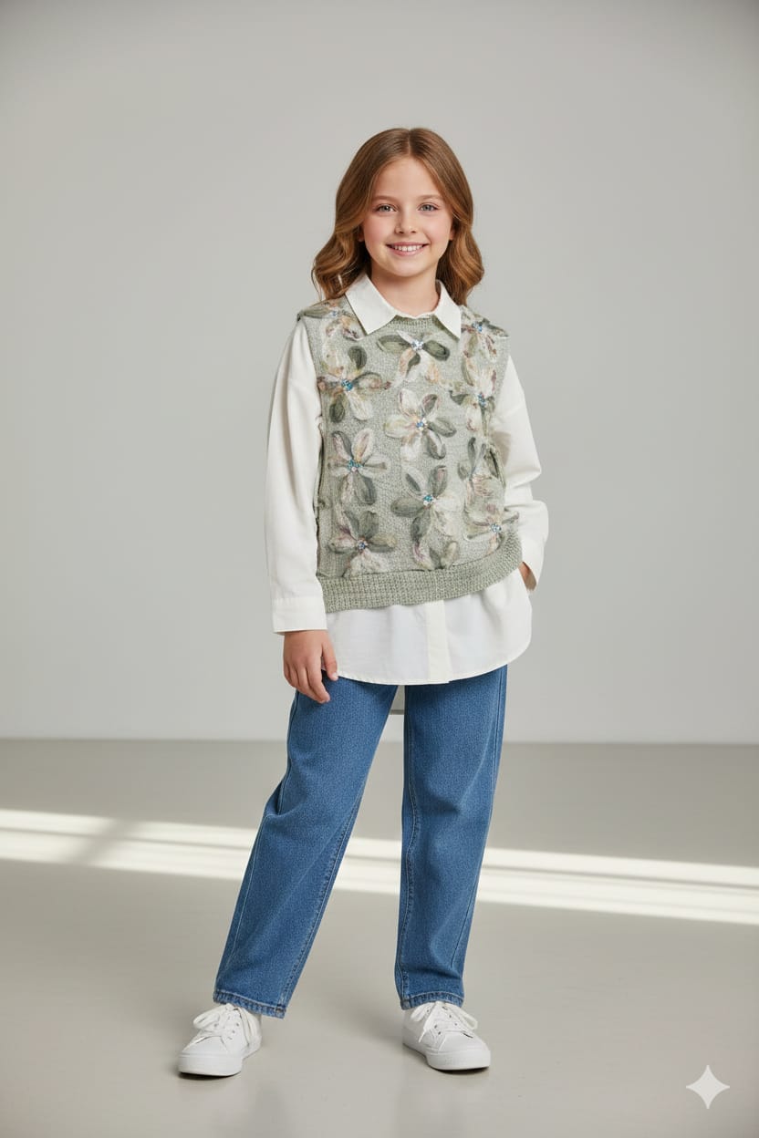 - Triko Kazak: Takımın en üst parçası olan triko kazak, %100 pamuklu iplikten üretilmiştir. Yumuşak dokusu sayesinde cilde zarar vermez, tam aksine konforlu bir giyim deneyimi sağlar. Üst kısmındaki modern desenler, çocukların seveceği eğlenceli bir şıklık katmaktadır.
